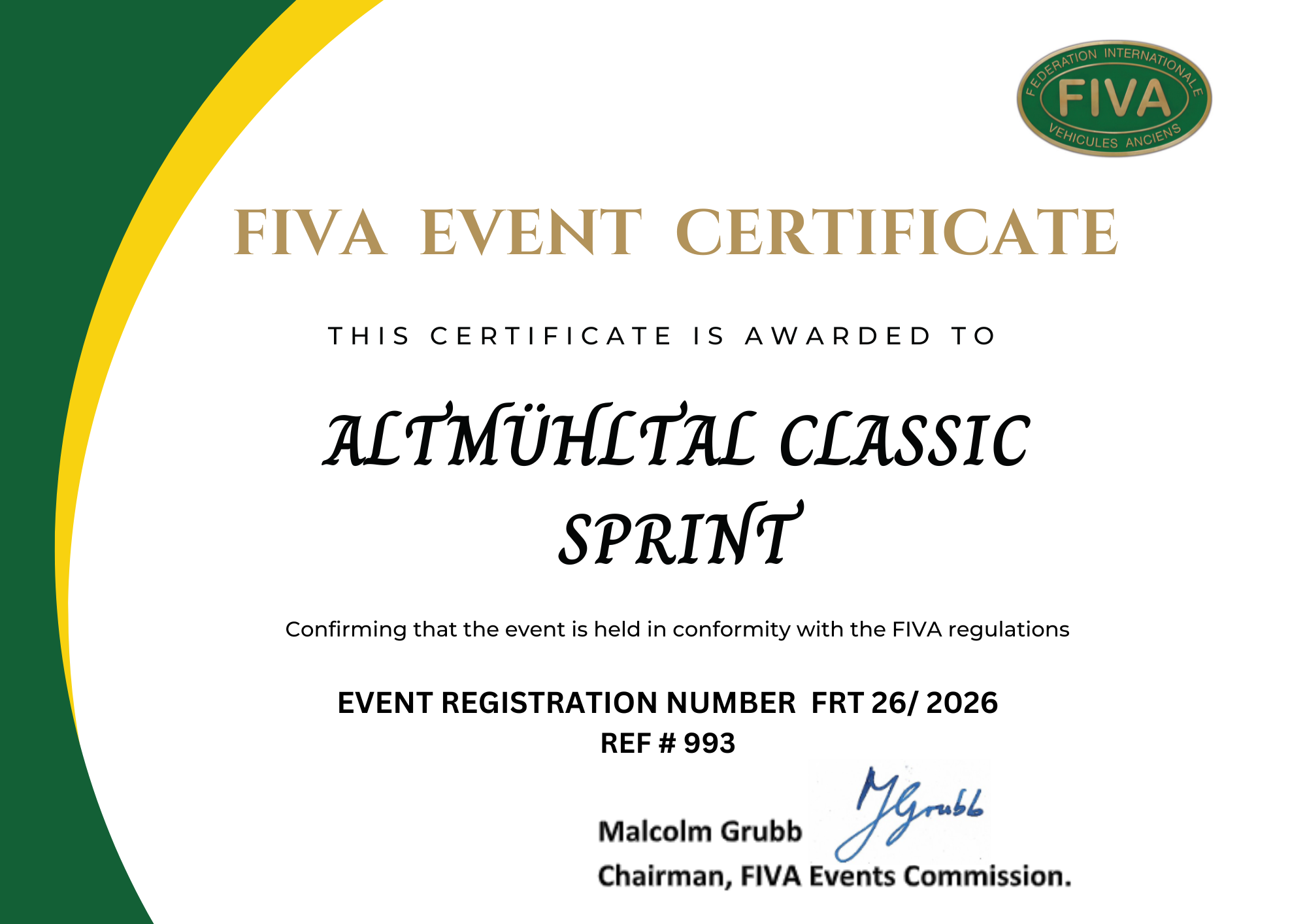 Pünktlich zum Jubiläum wurde der Altmühltal Classic Sprint von der FIVA (Fédération Internationale des Véhicules Anciens) offiziell anerkannt. Das Zertifikat hat die Nummer 26 /2026, was bedeutet, dass aktuell weltweit nur 26 Veranstaltungen diese Zertifizierung haben.